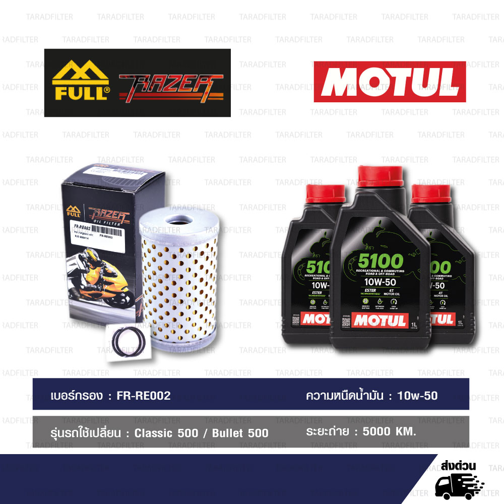 ![FULL RAZER ชุดถ่ายน้ำมันเครื่องกึ่งสังเคราะห์ MOTUL 5100 4T [ 10w-50 ] พร้อมกรองเครื่อง ใช้สำหรับ Royal Enfield Classic 500 / Bullet 500](https://www.taradfilter.com/wp-content/uploads/2020/07/Royal-Enfield-RE002-ขวดใหม่-16-1-69.jpg)
