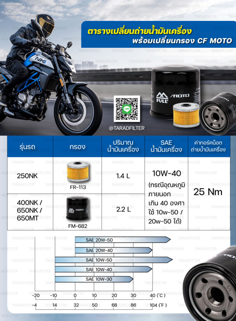 ตารางเปลี่ยนถ่ายน้ำมันเครื่องพร้อมเปลี่ยนกรอง CF MOTO รุ่นต่างๆ